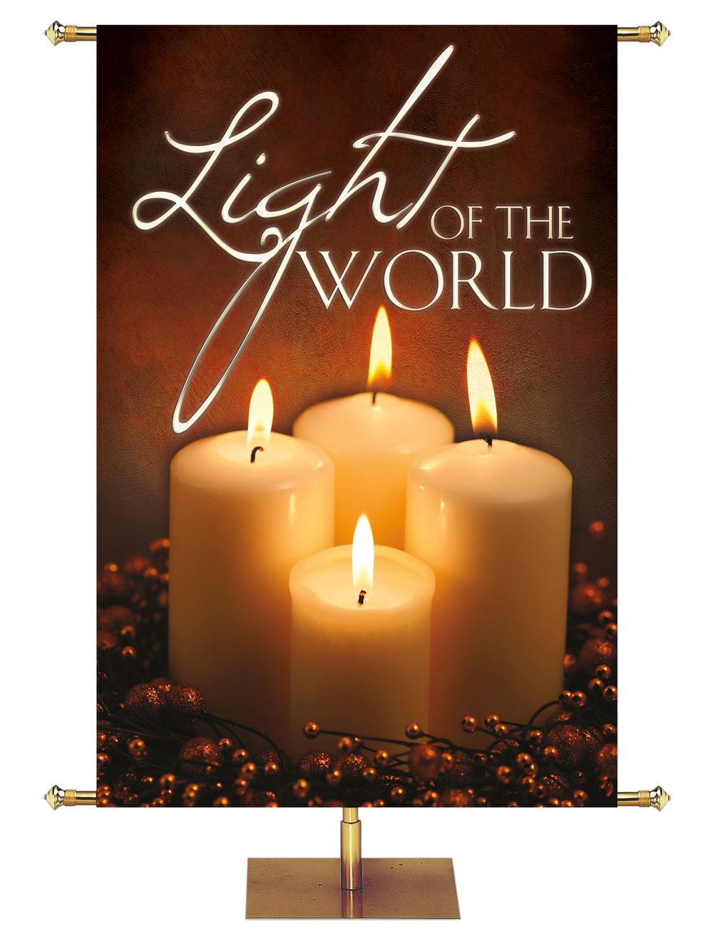 Estandartes de iglesia con fotografías de velas que celebran la temporada de Adviento . Los colores disponibles son azul y morado.